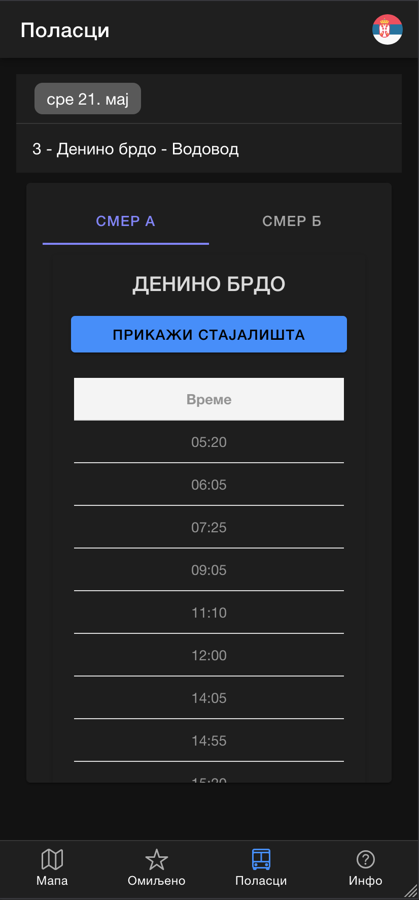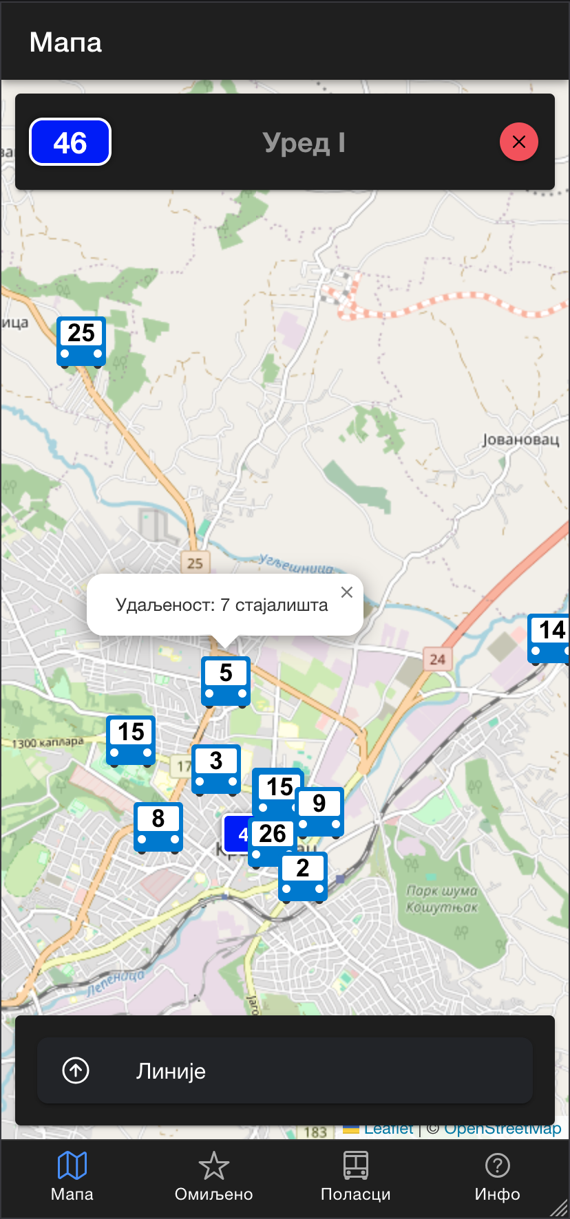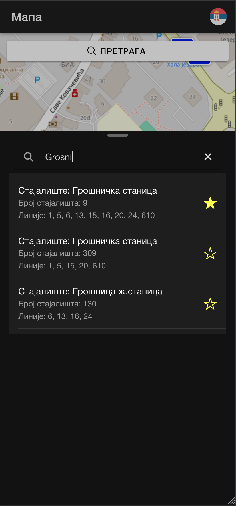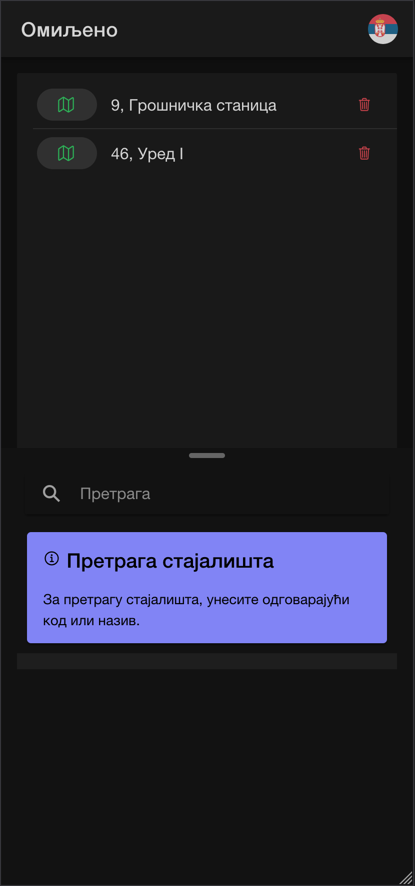 - Омиљена стајалишта: Сачувајте често коришћена стајалишта за брзи приступ мапи и информацијама.